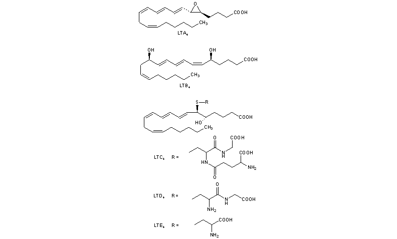 Literature References: A family of endogenous metabolites of arachidonic acid via the lipoxygenase pathway, chemically related to the prostaglandins and thromboxanes, q.q.v. The name leukotrienes was applied because of their origin in leukocytes and their conjugated triene structures. [For a description of the nomenclature of individual leukotrienes see B. Samuelsson, S. Hammarström, Prostaglandins 19, 645 (1980)]. Members of the group are potent bronchoconstrictors that play an important pathophysiological role in immediate hypersensitivity reactions; they have been proposed as mediators of the inflammatory process and some are potent chemotactic agents. Initial studies of novel arachidonate metabolites in rabbit polymorphonuclear leukocytes: P. Borgeat et al., J. Biol. Chem. 251, 7816 (1976); 252, 8772 (1977). Subsequent studies and structure of a dihydroxyeicosatetraenoic acid (leukotriene B, LTB4): P. Borgeat, B. Samuelsson, ibid. 254, 2643 (1979). LTB4 is formed from an unstable intermediate oxido-eicosatetraenoic acid, leukotriene A or LTA4: eidem, Proc. Natl. Acad. Sci. USA 76, 3213 (1979). Stereochemistry and enzymatic conversion of LTA4 to LTB4: O. Radmark et al., Biochem. Biophys. Res. Commun. 92, 954 (1980). Synthesis of the four optical isomers of LTA4: J. Rokach et al., Tetrahedron Lett. 22, 2759, 2763 (1981). Total synthesis of LTB4: E. J. Corey et al., J. Am. Chem. Soc. 102, 7984 (1980); Y. Guindon et al., Tetrahedron Lett. 23, 739 (1982). Formation of the 20-hydroxy and 20-carboxy metabolites of LTB4: G. Hansson et al., FEBS Lett. 130, 107 (1981); total synthesis: R. Zamboni, J. Rokach, Tetrahedron Lett. 23, 4751 (1982). Earlier studies had described a "slow-reacting substance of anaphylaxis" (SRS-A or SRS) released from guinea pig and cat lung by cobra venom and in guinea pig lung after anaphylactic shock, cf. W. S. Feldberg, C. H. Kellaway, J. Physiol. 94, 187 (1938); C. H. Kellaway, E. R. Trethewie, Q. J. Exp. Physiol. 30, 121 (1940). The relationship between SRS and members of the leukotriene family was established following publication of the uv spectrum of purified SRS-A, which showed the presence of the conjugated triene, cf. H. R. Morris et al., FEBS Lett. 87, 203 (1978). Purification and structure of LTC4, an SRS from mouse mastocytoma cells: R. C. Murphy et al., Proc. Natl. Acad. Sci. USA 76, 4275 (1979); S. Hammarström et al., Biochem. Biophys. Res. Commun. 91, 1266 (1979). Total synthesis of LTC4: E. J. Corey et al., J. Am. Chem. Soc. 102, 1436, 3663 (1980); J. Rokach et al., Tetrahedron Lett. 21, 1485 (1980). Identity of synthetic LTC4 with SRS from mouse mastocytoma cells: S. Hammarström et al., Biochem. Biophys. Res. Commun. 92, 946 (1980). Structure of the SRS from rat basophil leukemia cells (RBL-1) and identification as a leukotriene (LTD4): H. R. Morris et al., Prostaglandins 19, 185 (1980). It was subsequently proposed that LTC4 was an intermediate in the biosynthesis of LTD4. Identity of SRS-A released in sensitized guinea pig lung perfusates and LTD4: eidem, Nature 285, 104 (1980). Assignment of stereochemistry: eidem, Prostaglandins 20, 601 (1980). Detection of LTA4 as an intermediate in the biosynthesis of LTC4 and LTD4: S. Hammarström, B. Samuelsson, FEBS Lett. 122, 83 (1980). The sulfone of LTC4, which has also been proposed as a natural product, cf. H. Ohnishi et al., Prostaglandins 20, 655 (1980), has been found to be as potent as LTC4: T. Jones et al., ibid. 24, 279 (1982). Synthesis: Y. Girard et al., Tetrahedron Lett. 23, 1023 (1982). Discovery of LTF4: M. E. Anderson et al., Proc. Natl. Acad. Sci. USA 79, 1088 (1982). Synthesis: F. Ellis et al., Tetrahedron Lett. 23, 3735 (1982). It is now known that SRS-A is made up of varying amounts of cysteine-containing members of the leukotrienes, i.e. leukotrienes C4, D4, and E4. These three LTs are generally found to be 100 to 1000 times more potent, on a molar basis, than histamine or prostaglandins in their effects on pulmonary airways. Review of chemistry and structure elucidation: D. A. Clark, A. Marfat, Annu. Rep. Med. Chem. 17, 291-300 (1982). Comprehensive review of synthesis of leukotrienes and other lipoxygenase-derived products: J. G. Atkinson, J. Rokach, in Handbook of Eicosanoids: Prostaglandins and Related Lipids IB, A. L. Willis, Ed. (CRC Press, Boca Raton, 1987) pp 175-263. General reviews: P. Sirois, P. Borgeat, Int. J. Immunopharmacol. 2, 281-293 (1980); P. Borgeat, P. Sirois, J. Med. Chem. 24, 121-126 (1981); B. Samuelsson, Int. Arch. Allergy Appl. Immunol. 66, Suppl. 1, 98-106 (1981); L. S. Wolfe, J. Neurochem. 38, 1-14 (1982); J. L. Marx, Science 215, 1380-1384 (1982); B. Samuelsson, S. Hammarström, Vitam. Horm. 39, 1-30 (1982). Books: SRS-A and Leukotrienes, P. J. Piper, Ed. (Research Studies Press, London, 1981) 279 pp; Advances in Prostaglandin, Thromboxane, and Leukotriene Research vol. 9, B. Samuelsson, R. Paoletti, Eds. (Raven Press, New York, 1982) 341 pp.
