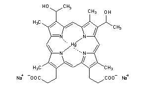 CAS Name: [7,12-Bis(1-hydroxyethyl)-3,8,13,17-tetramethyl-21H,23H-porphine-2,18-dipropanoato(4-)-N21,N22,N23,N24]mercurate(2-) disodium