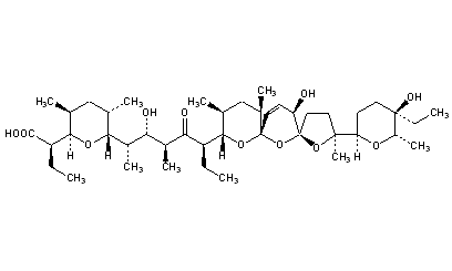 Literature References: Main component of a polyether antibiotic complex produced by Streptomyces aureofaciens NRRL 5758 & NRRL 8092. Production: D. H. Berg et al., DE 2525095 corresp to US 4038384 (1975, 1977 to Lilly); L. D. Boeck et al., Dev. Ind. Microbiol. 18, 471 (1976). Isoln and characterization: D. H. Berg, R. L. Hamill, J. Antibiot. 31, 1 (1978). Biosynthetic studies using 13C-NMR study: D. E. Dorman et al., Helv. Chim. Acta 59, 2625 (1976). Structure: J. L. Occolowitz et al., Biomed. Mass Spectrom. 3, 272 (1976); H. Seto et al., J. Antibiot. 30, 530 (1977). Anticoccidial activity: M. D. Ruff et al., Poult. Sci. 59, 2008 (1980). Total synthesis: Y. Kishi et al., Front. Chem., Plenary Keynote Lect. IUPAC Congr., 28th 1981, K. J. Laidler, Ed. (Pergamon, Oxford, 1982) pp 287-304. HPLC determn in animal feeds: M. R. LaPointe, H. Cohen, J. Assoc. Off. Anal. Chem. 71, 480 (1988).