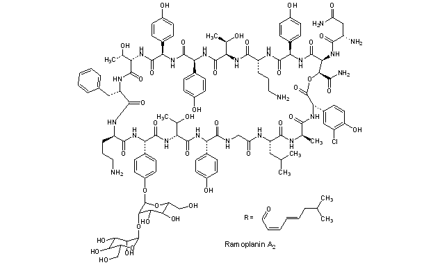 Literature References: Glycolipodepsipeptide antibiotic complex consisting of 6 related components (A1, A2, A3, A¢1, A¢2, A¢3) of which A2 is the most abundant. Isoln and inital characterization from Actinoplanes sp.: B. Cavalleri et al., DE 3013246; eidem, US 4303646 (1980, 1981 both to Gruppo Lepetit); idem et al., J. Antibiot. 37, 309 (1984). Bactericidal activity: R. Pallanza et al., ibid. 318. Structure elucidation: R. Ciabatti et al., ibid. 42, 254 (1989); and sequence determn: J. K. Kettenring et al., ibid. 268. 3D structure: M. Kurz, W. Guba, Biochemistry 35, 12570 (1996). Isoln and characterization of the A¢ factors: L. Gastaldo et al., J. Indus. Microbiol. 11, 13 (1992). Determn in sera: M. T. Kenny et al., Diagn. Microbiol. Infect. Dis. 18, 117 (1994). Clinical evaluation against vancomycin resistant enterococci (VRE): M. T. Wong et al., Clin. Infect. Dis. 33, 1476 (2001). Review of discovery and chemistry: F. Parenti et al., Drugs Exp. Clin. Res. 16, 451-455 (1990); of chemistry and mechanism of action: S. Walker et al., Chem. Rev. 105, 449-475 (2005); of pharmacology and clinical potential: D. K. Farver et al., Ann. Pharmacother. 39, 863-868 (2005).
