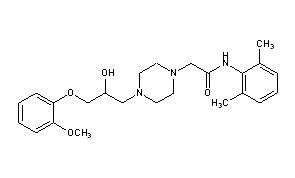 Additional Names: (±)-4-[2-hydroxy-3-(o-methoxyphenoxy)propyl]-1-piperazineaceto-2¢,6¢-xylidide; (±)-1-[3-(2-methoxyphenoxy)-2-hydroxypropyl]-4-[N-(2,6-dimethylphenyl)carbamoylmethyl]piperazine