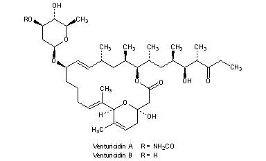Literature References: Antifungal antibiotics isolated from Streptomyces aureofaciens strains. Preliminary isolation work: Rhodes et al., Nature 192, 952 (1962). Isoln of venturicidins A and B and activity studies: Brufani et al., Helv. Chim. Acta 51, 1293 (1968); see also Langcake et al., Biochem. Soc. Trans. 2, 202 (1974). Final structures: Brufani et al., Experientia 27, 604 (1971); eidem, Helv. Chim. Acta 55, 2329 (1972).
