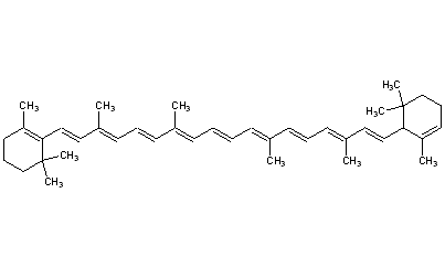 Properties: Deep purple prisms, polyhedra from petr ether or from benzene + methanol, mp 187.50° (evacuated tube). [a]18643 +385° (c = 0.08 in benzene). Absorption max (CHCl3): 485, 454 nm. More sol than b-carotene. Freely sol in carbon disulfide, chloroform; sol in ether, benzene. Slightly sol in petr ether, alcohol. 100 ml hexane dissolves 294 mg at 0°. Practically insol in water, acids, alkalies. Absorbs oxygen from the air, giving rise to inactive colorless oxidation products. The oxidation in light is autocatalytic. Store in darkness in sealed ampoules and at low temp (-20°C).