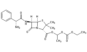 Additional Names: (2S,5R,6R)-6-[(R)-(2-amino-2-phenylacetamido)]-3,3-dimethyl-7-oxo-4-thia-1-azabicyclo[3.2.0]heptane-2-carboxylic acid ester with ethyl 1-hydroxyethyl carbonate; 6-[(R)-2-amino-2-phenylacetamido]penicillanic acid [1-(ethoxycarbonyloxy)ethyl] ester; 1¢-ethoxycarbonyloxyethyl 6-(D-a-aminophenylacetamido)penicillanate