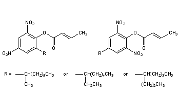 Literature References: Originally thought to be 2-(1-methylheptyl)-4,6-dinitrophenyl butenoate, it is actually a mixture of 2(or 4)-octyl-4,6(or 2,6)-dinitrophenyl butenoate in which the octyl is a mixture of 1-methylheptyl, 1-ethylhexyl, and 1-propylpentyl. Prepn: W. F. Hester et al., US 2526660 (1950 to Rohm & Haas). Fungicidal activity and chemical constitution: A. H. M. Kirby et al., Ann. Appl. Biol. 57, 211 (1966); R. J. W. Byrde et al., ibid. 223. Mitocidal activity: N. D. Rishi, A. Q. Rather, J. Entomol. Res. 7, 39 (1983). Degradation in soil: W. Mittelstaedt, F. Fuhr, J. Agric. Food Chem. 32, 1151 (1984). Persistence on crops: B. D. Ripley et al., Can. J. Plant Sci. 65, 229 (1985). HPLC residue analysis in crops: D. Liang et al., J. Chromatogr. 387, 385 (1987). Acute and chronic toxicity: P. S. Larson et al., Arch. Int. Pharmacodyn. Ther. 119, 31 (1959). Evaluation of developmental toxicity in rodents of technical grade and selected isomers: L. E. Gray, Jr. et al., Teratog. Carcinog. Mutagen. 6, 33 (1986); J. M. Rogers et al., ibid. 7, 341 (1987).