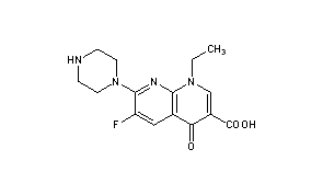 CAS Name: 1-Ethyl-6-fluoro-1,4-dihydro-4-oxo-7-(1-piperazinyl)-1,8-naphthyridine-3-carboxylic acid