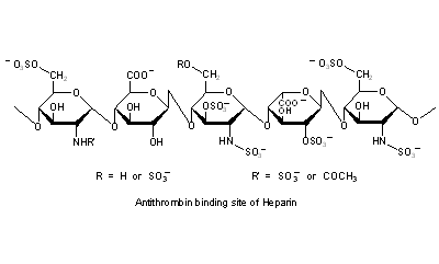 Literature References: Glycosaminoglycan with anticoagulant activity. Heterogenous mixture of variably sulfated polysaccharide chains composed of repeating units of D-glucosamine and either L-iduronic or D-glucuronic acids. Mol wt ranges from 6000-30000 Da. Biosynthesized and stored in mast cells of various animal tissues, particularly liver, lung or gut. Commercial heparin is isolated from beef lung or pork intestinal mucosa. Isoln from mammalian tissue: Howell, Am. J. Physiol. 63, 434 (1922-23); 71, 553 (1924-25); Korn, J. Biol. Chem. 234, 1325 (1959); L. B. Jaques, Can. J. Biochem. Physiol. 37, 1183 (1959); J. A. Bush et al., US 2884358 (1959 to So. Calif. Gland). Purification: G. Nominé et al., US 2989438 (1961 to UCLAF); Toccaceli, US 3016331 (1962 to Ormonoterapia Richter); L. Roden et al., Methods Enzymol. 26, 73 (1972). Structural studies: M. L. Wolfrom, J. Am. Chem. Soc. 72, 5796 (1950); Velluz et al., Compt. Rend. 247, 1521 (1958); M. L. Wolfrom et al., J. Org. Chem. 29, 540 (1964). Configuration of glycosidic linkages: M. L. Wolfrom et al., ibid. 31, 1173 (1966); A. S. Perlin et al., Can. J. Chem. 48, 2260 (1970); T. Helting, U. Lindahl, J. Biol. Chem. 246, 5442 (1971). Identification of L-iduronic acid residues: A. S. Perlin et al., Carbohydr. Res. 7, 369 (1968). Antithrombotic activity results from the binding and activation of antithrombin III, a plasma protein which inhibits several enzymes in the coagulation cascade: R. D. Rosenberg, Fed. Proc. 36, 10 (1977). Anticoagulant activity is related to the mol wt of the polysaccharide fragments; low molecular weight components exhibit decreased hemorrhagic effects while retaining antithrombin binding ability: L.-O. Andersson et al., Thromb. Res. 15, 531 (1979); T. W. Barrowcliffe et al., Br. J. Haematol. 41, 573 (1979); J. Hirsch et al., Semin. Thromb. Hemostasis 11, 13 (1985). Characterization of the antithrombin binding site: U. Lindahl et al., Proc. Natl. Acad. Sci. USA 76, 3198 (1979); J. Choay et al., Thromb. Res. 18, 573 (1980). Synthesis of the pentasaccharide corresponding to the binding site sequence: eidem, Biochem. Biophys. Res. Commun. 116, 492 (1983). Symposium on structure, activity and clinical applications: Fed. Proc. 36, 9-116 (1977). Review of mechanism of action: I. Björk, U. Lindahl, Mol. Cell. Biochem. 48, 161-182 (1982); of structure-activity relationships and prepn of low mol wt fractions: B. Casu, Adv. Carbohydr. Chem. Biochem. 43, 51-134 (1985); of biosynthesis: U. Lindahl et al., Trends Biochem. Sci. 11, 221-225 (1986). Comprehensive description: F. Nachtmann et al., Anal. Profiles Drug Subs. 12, 215-276 (1983). Overview of clinical results in pulmonary embolism and venous thrombosis: R. Collins et al., N. Engl. J. Med. 318, 1162-1170 (1988); J. Hirsh, ibid. 324, 1565-1574 (1991); of clinical studies with low mol wt heparinoids: H. ten Cate et al., Am. J. Hematol. 27, 146-153 (1988).