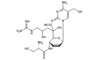 CAS Name: (S)-4-Amino-1-[4-[(2-amino-3-hydroxy-1-oxopropyl)amino]-9-[(aminoiminomethyl)amino]-6-C-carboxy-2,3,4,7,9-pentadeoxy-a-L-talo-non-2-enopyranosyl]-5-(hydroxymethyl)-2(1H)-pyrimidinone