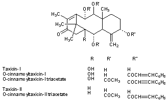 Literature References: Acyl-free polyols from which the taxines are prepared by partial esterfication: Baxter et al., J. Chem. Soc. 1962, 2964. Structure of taxicin-I and -II: Eyre et al, Proc. Chem. Soc. London 1963, 271. Structure and stereochemical studies of taxicin-I and -II: Dukes et al., Tetrahedron Lett. 1965, 4765; J. Chem. Soc. C 1967, 448; Eyre et al., ibid. 452. Structure of O-cinnamoyltaxicin-II triacetate (taxinine): Kurono et al., Tetrahedron Lett. 1963, 2153; Nakanishi, Kurono, ibid. 1963, 2161; Ueda et al., ibid. 1963, 2167; Uyeo et al., J. Pharm. Soc. Jpn. 84, 762 (1964). Stereochemistry of taxinine: Kurono et al., Tetrahedron Lett. 1965, 1917; Shiro et al., Chem. Commun. 1966, 97.