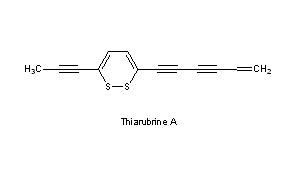 Literature References: Class of dark red bioactive dithiacyclohexadiene polyacetylenes found in various Asteraceae; A and B forms are most common. Used medicinally in Africa: J. M. Watt, M. G. Breyer-Brandwijk, The Medicinal and Poisonous Plants of Southern and Eastern Africa (E. & S. Livingstone Ltd., Edinburgh, 2nd edition, 1962) pp 202-205; leaves are consumed by chimpanzees possibly as a pharmaceutic: E. Rodriguez et al., Experientia 41, 419 (1985). Isoln: F. Bohlmann, K.-M. Kleine, Ber. 98, 3081 (1965); and separation by HPLC: R. A. Norton et al., Phytochemistry 24, 356 (1985); from Ambrosia chamissonis: S. Ellis et al., ibid. 33, 224 (1993). NMR spectra and biosynthetic study of A: M. L. Gomez-Barrios et al., ibid. 31, 2703 (1992). Synthesis of A: M. Koreeda, W. Yang, J. Am. Chem. Soc. 116, 10793, (1994); of B: E. Block et al., ibid. 9403. Antibiotic properties of A: G. H. N. Towers et al., Planta Med. 51, 225 (1985); photo-enhancement of activity: G. P. Constabel, G. H. N Towers, ibid. 55, 35 (1989). Antiviral properties of A: J. B. Hudson et al., ibid. 52, 51 (1986); photo-enhancement of activity against HIV: J. B. Hudson et al., Photochem. Photobiol. 57, 675 (1993).