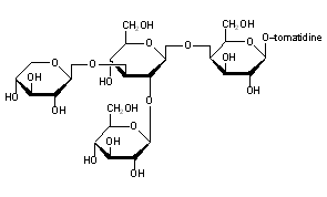 Literature References: Occurs in the extract of leaves of wild tomato plants: Fontaine et al., Arch. Biochem. 18, 467 (1948); Kuhn, Low, Ber. 81, 552 (1948); Kuhn et al., ibid. 83, 448 (1950); Bognar, Makleit, Pharmazie 11, 376 (1956). Yields on partial hydrolysis, besides a-tomatine, the main constituent, b1-, b2-, g- and d-tomatine: Kuhn et al., Ber. 90, 203 (1957). a-Tomatine consists of one mol tomatidine linked to a tetrasaccharide composed of 2 mols D-glucose, 1 mol D-xylose and 1 mol D-galactose: Kuhn et al., Angew. Chem. 68, 212 (1956). Proposed as an alternate precipitant to digitonin: Schultz, Sander, Z. Physiol. Chem. 308, 122 (1957). Structure: Reichstein, ibid. 74, 887 (1962). Toxicity study: Wilson et al., Toxicol. Appl. Pharmacol. 3, 39 (1961).