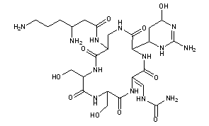 Literature References: Polypeptide antibiotic produced by various Streptomyces species including S. puniceus, S. floridae, S. vinaceus. Isoln: A. C. Finlay et al., Am. Rev. Tuberc. 63, 1 (1951); Bartz et al., ibid. 4. Production: Marsh et al., US 2633445 (1953 to Ciba); Freaney, US 2828245 (1958 to C.S.C.). Purification and chemical characterization: T. Kitagawa et al., Chem. Pharm. Bull. 20, 2176 (1972). Proposed structure: Yoshioka et al., Tetrahedron Lett. 1971, 2043. Alternate structure: B. W. Bycroft et al., ibid. 1968, 5901; eidem, Experientia 27, 501 (1971); eidem, J. Chem. Soc. Perkin Trans. 1 1972, 820, 827. Confirmed structure: Noda et al., J. Antibiot. 25, 427 (1972); T. Kitagawa et al., Chem. Pharm. Bull. 20, 2215 (1972). X-ray crystallography: B. W. Bycroft, Chem. Commun. 1972, 660. Biosynthesis: J. H. Carter II et al., Biochemistry 13, 1221, 1227 (1974). Toxicological study: H. Keller et al., Arzneim.-Forsch. 6, 61 (1956). Enzyme immunoassay for determn in body fluids: T. Kitagawa et al., Chem. Pharm. Bull. 30, 2487 (1982).