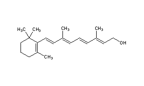 Literature References: Fat soluble, essential micronutrient. Occurs preformed only in animals; metabolized from carotenoids, such as b-carotene, q.v., in the intestinal mucosa. Dietary sources include liver, milk, butter, cheese, eggs and fish liver oils or as carotenoids from fruits and vegetables. Stored primarily in the liver in esterified form; transported in the blood by retinol binding protein (RBP). Oxidized to retinal, q.v., a key component of the visual system, and to retinoic acid, q.v., which effects gene expression via specific nuclear receptors. Identification as essential nutrient in butter and egg: E. V. McCollum, M. Davis, J. Biol. Chem. 15, 167 (1913). Isoln from fish oil: P. Karrer et al., Helv. Chim. Acta 14, 1036 (1931). Structure: eidem, ibid. 1431; I. M. Heilbron et al., Biochem. J. 26, 1194 (1932). Synthesis: O. Isler et al., Helv. Chim. Acta 30, 1911 (1947); N. L. Wendler et al., J. Am. Chem. Soc. 72, 234 (1950); T. Mukaiyama, A. Ishida, Chem. Lett. 1975, 1201. Stereospecific synthesis: P. S. Manchand et al., Helv. Chim. Acta 59, 567 (1976); G. Cardillo et al., J. Chem. Soc. Perkin Trans. 1 1979, 1729. Toxicology: J. J. Kamm, J. Am. Acad. Dermatol. 6, 652 (1982). Review: W. Friedrich in Vitamins (Walter de Gruyter, New York, 1988) pp 63-140. Book: The Retinoids, M. B. Sporn et al., Eds. (Raven Press, New York, 1994) 679pp. Review of role in vision: R. K. Crouch et al., Photochem. Photobiol. 64, 613-621 (1996); of physiological functions and dietary requirements in humans: H. Gerster, Int. J. Vitam. Nutr. Res. 67, 71-90 (1997); of metabolism and transport: E. H. Harrison, Annu. Rev. Nutr. 18, 259-276 (1998).