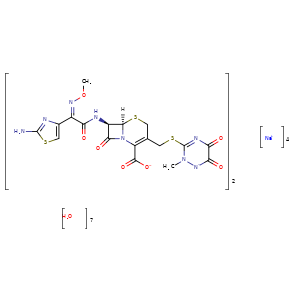 | SMILES | N12C(=C(CS[C@]2([H])[C@H](NC(/C(/c3nc(N)sc3)=N\OC)=O)C1=O)CSc4n([n-]c(=O)c(n4)=O)C)C(=O)[O-].O.[Na+].N12C(=C(CS[C@]1([H])[C@H](NC(/C(/c3nc(N)sc3)=N\OC)=O)C2=O)CSc4n([n-]c(=O)c(n4)=O)C)C(=O)[O-].O.O.O.O.O.O.[Na+].[Na+].[Na+] |