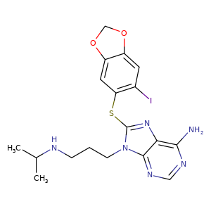 Ic1c(Sc2n(CCCNC(C)C)c3c(n2)c(N)ncn3)cc4c(c1)OCO4