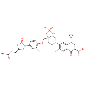 | SMILES | CC(NC[C@H]1CN(c2cc(F)c(OCC3(OP(=O)(O)O)CCN(c4c(F)cc5c(c(C(=O)O)cn(c5c4)C6CC6)=O)CC3)cc2)C(=O)O1)=O |