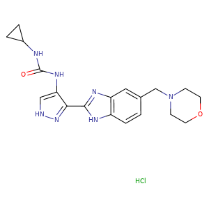 | SMILES | c1cc(CN2CCOCC2)cc3c1[nH]c(-c4c(c[nH]n4)NC(NC5CC5)=O)n3.Cl |