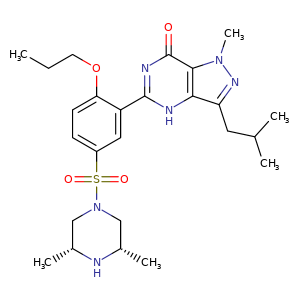 | SMILES | c12c(n(C)nc1CC(C)C)c(=O)nc(-c3cc(S(N4C[C@@H](C)N[C@@H](C)C4)(=O)=O)ccc3OCCC)[nH]2 |