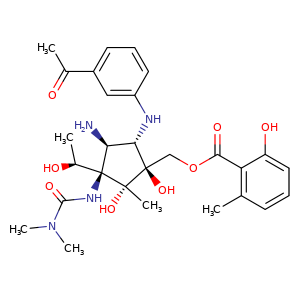 | 异名/同义词 | 2,6-CRESOTIC ACID, MONOESTER WITH 3-(4-(M-ACETYLANILINO)-5-AMINO-2,3-DIHYDROXY-1-(1-HYDROXYETHYL)-2-(HYDROXYMETHYL)-3-METHYLCYCLOPENTYL)-1,1-DIMETHYLUREA BENZOIC ACID, 2-HYDROXY-6-METHYL-, ((1S,2R,3R,4S,5S)-5-((3-ACETYLPHENYL)AMINO)-4-AMINO-3-(((DIMETHYLAMINO)CARBONYL)AMINO)-1,2-DIHYDROXY-3-((1S)-1-HYDROXYETHYL)-2-METHYLCYCLOPENTYL)METHYL ESTER NSC-52947 PACTAMYCIN PACTAMYCIN [MI]