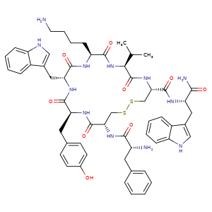 | SMILES | C(=O)(N)[C@H](Cc1c[nH]c2ccccc12)NC(=O)[C@@H]3CSSC[C@@H](C(N[C@H](C(N[C@@H](C(N[C@H](C(N[C@H](C(N3)=O)C(C)C)=O)CCCCN)=O)Cc4c[nH]c5ccccc45)=O)Cc6ccc(O)cc6)=O)NC(=O)[C@H](N)Cc7ccccc7 |