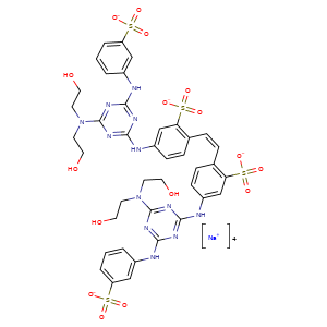 | SMILES | N(CCO)(CCO)c1nc(Nc2cc(S(=O)(=O)[O-])c(cc2)/C=C\c3c(S(=O)(=O)[O-])cc(cc3)Nc4nc(N(CCO)CCO)nc(n4)Nc5cc(S(=O)(=O)[O-])ccc5)nc(n1)Nc6cc(S(=O)(=O)[O-])ccc6.[Na+].[Na+].[Na+].[Na+] |