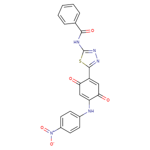 | SMILES | O=C1C=C(Nc2ccc([N+]([O-])=O)cc2)C(=O)C=C1c3nnc(NC(c4ccccc4)=O)s3 |