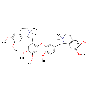 | 异名/同义词 | 1-((4,5-DIMETHOXY-2-(2-METHOXY-5-((1,2,3,4-TETRAHYDRO-6,7-DIMETHOXY-2,2-DIMETHYLISOQUINOLINIO)METHYL)PHENOXY)PHENYL)METHYL)-1,2,3,4-TETRAHYDRO-6,7-DIMETHOXY-2,2-DIMETHYLISOQUINOLINIUM ISOQUINOLINIUM, 1-((4,5-DIMETHOXY-2-(2-METHOXY-5-((1,2,3,4-TETRAHYDRO-6,7-DIMETHOXY-2,2-DIMETHYLISOQUINOLINIO)METHYL)PHENOXY)PHENYL)METHYL)-1,2,3,4-TETRAHYDRO-6,7-DIMETHOXY-2,2-DIMETHYL- ISOQUINOLINIUM, 1-((4,5-DIMETHOXY-2-(2-METHOXY-5-((1,2,3,4-TETRAHYDRO-6,7-DIMETHOXY-2,2-DIMETHYLISOQUINOLINIUM-1-YL)METHYL)PHENOXY)PHENYL)METHYL)-1,2,3,4-TETRAHYDRO-6,7-DIMETHOXY-2,2-DIMETHYL-