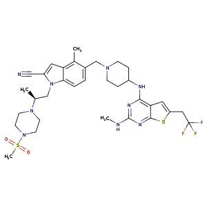 | 异名/同义词 | (7S)-84-(METHANESULFONYL)-54,7-DIMETHYL-12-(METHYLAMINO)-16-(2,2,2-TRIFLUOROETHYL)-2-AZA-1(4)-THIENO(2,3-D)PYRIMIDINA-5(5,1)-INDOLA-8(1)-PIPERAZINA-3(4,1)-PIPERIDINAOCTAPHANE-52-CARBONITRILE 1H-INDOLE-2-CARBONITRILE, 4-METHYL-5-((4-((2-(METHYLAMINO)-6-(2,2,2-TRIFLUOROETHYL)THIENO(2,3-D)PYRIMIDIN-4-YL)AMINO)-1-PIPERIDINYL)METHYL)-1-((2S)-2-(4-(METHYLSULFONYL)-1-PIPERAZINYL)PROPYL)- 4-METHYL-5-((4-((2-(METHYLAMINO)-6-(2,2,2-TRIFLUOROETHYL)THIENO(2,3-D)PYRIMIDIN-4-YL)AMINO)-1-PIPERIDINYL)METHYL)-1-((2S)-2-(4-(METHYLSULFONYL)-1-PIPERAZINYL)PROPYL)-1H-INDOLE-2-CARBONITRILE KO-539 KO539 MENIN-MIXED LINEAGE LEUKEMIA PROTEIN-PROTEIN INTERACTION INHIBITOR KO 539 ZIFTOMENIB ZIFTOMENIB [INN] ZIFTOMENIB [USAN] ZIFTOMENIB [WHO-DD]