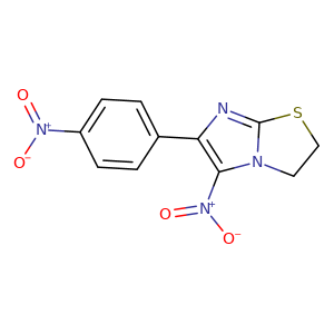 | SMILES | [N+](=O)([O-])c1n2c(nc1-c3ccc(cc3)[N+](=O)[O-])SCC2 |