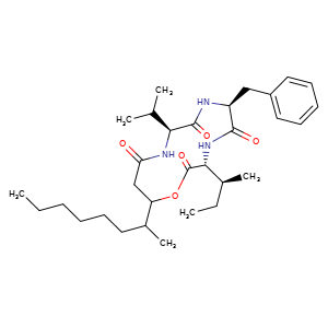 | 异名/同义词 | 1-OXA-4,7,10-TRIAZACYCLOTRIDECANE-2,5,8,11-TETRONE, 6-BENZYL-3-SEC-BUTYL-9-ISOPROPYL-13-OCTYL-, STEREOISOMER BEAUVERILIDE A BEAUVEROLIDE BA CYCLO(D-ALLOISOLEUCYL-3-HYDROXY-4-METHYLDECANOYL-L-VALYL-L-PHENYLALANYL) D-ALLOISOLEUCINE, N-(N-(N-(3-HYDROXY-4-METHYL-1-OXODECYL)-L-VALYL)-L-PHENYLALANYL)-, .LAMBDA.-LACTONE