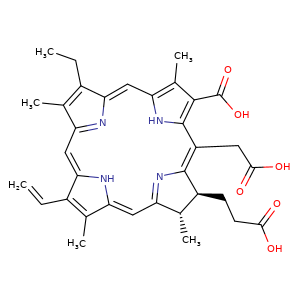 | SMILES | c1(c2c(c(c(cc3C(=C(c(cc4c(c(c(cc5[C@H]([C@@H](c1n5)CCC(=O)O)C)[nH]4)C)C=C)n3)C)CC)[nH]2)C)C(=O)O)CC(=O)O |