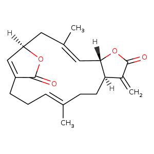 | 异名/同义词 | (3AS,6E,13S,15E,16AR)-3A,4,5,8,9,13,14,16A-OCTAHYDRO-6,15-DIMETHYL-3-METHYLENE-11H-13,10-METHENOFURO(2,3-F)OXACYCLOPENTADECIN-2,11(3H)-DIONE (3E,12E)-3,12-DIMETHYL-8-METHYLENE-6,18-DIOXA-TRICYCLO(14.2.1.0.5,9)NONADECA-3,12,16(19)-TRIENE-7,17-DIONE 11H-13,10-METHENOFURO(2,3-F)OXACYCLOPENTADECIN-2,11(3H)-DIONE, 3A,4,5,8,9,13,14,16A-OCTAHYDRO-6,15-DIMETHYL-3-METHYLENE-, (3AS,6E,13S,15E,16AR)- AR-100 (OV) AR-100DP1 AR100 AR100DP1 NSC-156130 NSC-272353 OVATODIOLIDE