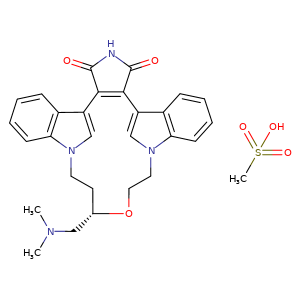 | 异名/同义词 | 9-((DIMETHYLAMINO)METHYL)-6,7,10,11-TETRAHYDRO-9H,18H-5,21:12,17-DIMETHENODIBENZO(E,K)PYRROLO(3,4-H)(1,4,13)OXADIAZACYCLOHEXADECINE-18,20(19H)-DIONE, METHANESULFONATE, (9S)- RUBOXISTAURIN MESILATE RUBOXISTAURIN MESYLATE RUBOXISTAURIN METHANESULFONATE ANHYDROUS [MI] RUBOXISTAURIN MESILATE [WHO-DD]