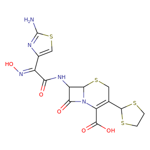 | 异名/同义词 | 5-THIA-1-AZABICYCLO(4.2.0)OCT-2-ENE-2-CARBOXYLIC ACID, 7-(((2-AMINO-4-THIAZOLYL)(HYDROXYIMINO)ACETYL)AMINO)-3-(1,3-DITHIOLAN-2-YL)-8-OXO-, (6R-(6.ALPHA.,7.BETA.(Z)))- 7-.BETA.-((Z)-2-(2-AMINO-4-THIAZOLYL)-2-HYDROXY-IMINOACETAMIDO)-3-(L, 3-DITHIOLAN-2-YL)-3-CEPHEM-4-CARBOXYLIC ACID YM-22508
