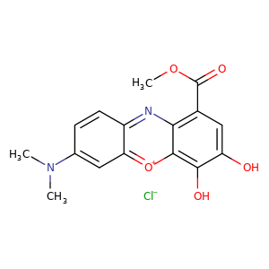 | SMILES | c12c(c(cc(c1O)O)C(=O)OC)nc3ccc(cc3[o+]2)N(C)C.[Cl-] |