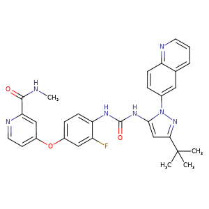 | SMILES | c1(cc(ccn1)Oc2cc(c(cc2)NC(=O)Nc3cc(nn3-c4cc5cccnc5cc4)C(C)(C)C)F)C(=O)NC |