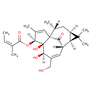| SMILES | [C@H]1(OC(/C(=C\C)/C)=O)C(=C[C@]23C([C@@H](C=C([C@H]([C@@]21O)O)CO)[C@]4([C@](C4(C)C)(C[C@H]3C)[H])[H])=O)C |