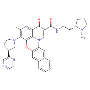 | 异名/同义词 | 3H-BENZO(B)PYRIDO(3,2,1-KL)PHENOXAZINE-2-CARBOXAMIDE, 5-FLUORO-N-(2-((2S)-1-METHYL-2-PYRROLIDINYL)ETHYL)-3-OXO-6-((3S)-3-(2-PYRAZINYL)-1-PYRROLIDINYL)- 3H-BENZO(B)PYRIDO(3,2,1-KL)PHENOXAZINE-2-CARBOXAMIDE, 5-FLUORO-N-(2-((2S)-1-METHYL-2-PYRROLIDINYL)ETHYL)-3-OXO-6-((3S)-3-PYRAZINYL-1-PYRROLIDINYL)- 5-FLUORO-N-(2-((2S)-1-METHYLPYRROLIDIN-2-YL)ETHYL)-3-OXO-6-((3S)-3-PYRAZIN-2-YLPYRROLIDIN-1-YL)-3H-BENZO(B)PYRIDO(3,2,1-KL)PHENOXAZINE-2-CARBOXAMIDE ITARNAFLOXIN, (S)- QUARFLOXIN, (S)-