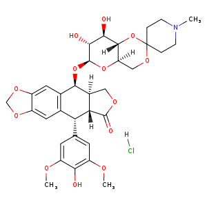 | 异名/同义词 | 4'-DEMETHYL-1-O-(4,6-O-(1-METHYL-4-PIPERIDYLIDENE)-.BETA.-D-GLUCOPYRANOSYL)EPIPODOPHYLLOTOXIN HYDROCHLORIDE COMPOUND 27-487 FURO(3',4':6,7)NAPHTHO(2,3-D)-1,3-DIOXOL-6(5AH)-ONE, 5,8,8A,9-TETRAHYDRO-5-(4-HYDROXY-3,5-DIMETHOXYPHENYL)-9-((4,6-O-(1-METHYL-4-PIPERIDINYLIDENE)-.BETA.-D-GLUCOPYRANOSYL)OXY)-, (5R-(5.ALPHA.,5A.BETA.,8A.ALPHA.,9.BETA.))-, HYDROCHLORIDE NSC-B-116351