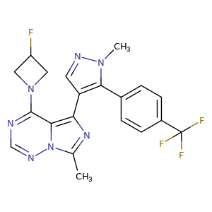 | SMILES | n1c(c2n(nc1)c(nc2-c3c(n(nc3)C)-c4ccc(cc4)C(F)(F)F)C)N5CC(C5)F |