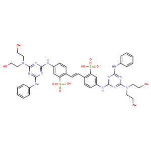 | SMILES | c1(cc(ccc1\C=C\c2c(cc(cc2)Nc3nc(nc(n3)N(CCO)CCO)Nc4ccccc4)S(=O)(O)=O)Nc5nc(nc(n5)N(CCO)CCO)Nc6ccccc6)S(=O)(O)=O |