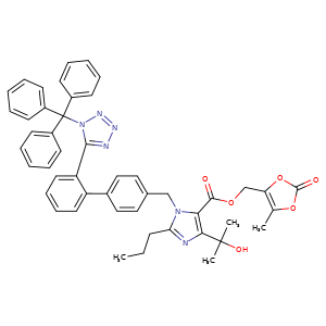 | 异名/同义词 | (5-METHYL-2-OXO-1,3-DIOXOL-4-YL)METHYL 4-(2-HYDROXYPROPAN-2-YL)-2-PROPYL-1-((2'-(1-TRITYL-1H-TETRAZOL-5-YL)BIPHENYL-4-YL)METHYL)-1H-IMIDAZOLE-5-CARBOXYLATE 1H-IMIDAZOLE-5-CARBOXYLIC ACID, 4-(1-HYDROXY-1-METHYLETHYL)-2-PROPYL-1-((2'-(1-(TRIPHENYLMETHYL)-1H-TETRAZOL-5-YL)(1,1'-BIPHENYL)-4-YL)METHYL)-, (5-METHYL-2-OXO-1,3-DIOXOL-4-YL)METHYL ESTER N1-TRITYLOLMESARTAN MEDOXOMIL OLMESARTAN MEDOXOMIL IMPURITY, N-ALKYL IMPURITY- [USP IMPURITY] TRITYLOLMESARTAN MEDOXOMIL