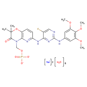 | SMILES | c1(nc2c(cc1)OC(C(N2COP([O-])([O-])=O)=O)(C)C)Nc3c(F)cnc(Nc4cc(c(c(OC)c4)OC)OC)n3.O.[Na+].O.O.O.O.O.[Na+] |