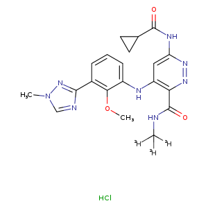 | SMILES | Cl.O(c1c(Nc2cc(NC(C3CC3)=O)nnc2C(=O)NC([2H])([2H])[2H])cccc1-c4nn(C)cn4)C |