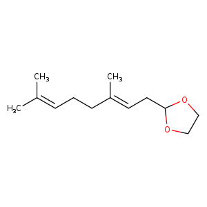 | 异名/同义词 | 1,3-DIOXOLANE, 2-(3,7-DIMETHYL-2,6-OCTADIEN-1-YL)- 1,3-DIOXOLANE, 2-(3,7-DIMETHYL-2,6-OCTADIENYL)- 2-(3,7-DIMETHYL-2,6-OCTADIEN-1-YL)-1,3-DIOXOLANE 2-(3,7-DIMETHYLOCTA-2,6-DIENYL)-1,3-DIOXOLANE |