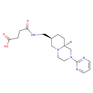 | 异名/同义词 | 4-((((7R,9AS)-OCTAHYDRO-2-(2-PYRIMIDINYL)-2H-PYRIDO(1,2-A)PYRAZIN-7-YL)METHYL)AMINO)-4-OXOBUTANOIC ACID BUTANOIC ACID, 4-((((7R,9AS)-OCTAHYDRO-2-(2-PYRIMIDINYL)-2H-PYRIDO(1,2-A)PYRAZIN-7-YL)METHYL)AMINO)-4-OXO- BUTANOIC ACID, 4-(((OCTAHYDRO-2-(2-PYRIMIDINYL)-2H-PYRIDO(1,2-A)PYRAZIN-7-YL)METHYL)AMINO)-4-OXO-, (7R-TRANS)- CP-93,393 METABOLITE M9