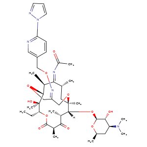 | 异名/同义词 | EDP-013420 EDP-420 EP-13420 ERYTHROMYCIN, 9-(ACETYLIMINO)-3-DE((2,6-DIDEOXY-3-C-METHYL-3-O-METHYL-.ALPHA.-L-RIBO-HEXOPYRANOSYL)OXY)-9-DEOXO-3-OXO-6,11-O-((2E)-2-(((6-(1H-PYRAZOL-1-YL)-3-PYRIDINYL)METHOXY)IMINO)-1,3-PROPANEDIYL)-, (9E)- MODITHROMYCIN MODITHROMYCIN [INN] MODITHROMYCIN [USAN] MODITHROMYCIN [WHO-DD]