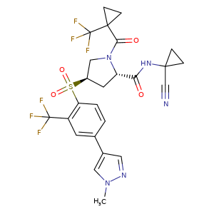 | 异名/同义词 | (2S,4R)-N-(1-CYANOCYCLOPROPYL)-4-(4-(1-METHYL-1H-PYRAZOL-4-YL)-2-(TRIFLUOROMETHYL)BENZENESULFONYL)-1-(1-(TRIFLUOROMETHYL)CYCLOPROPANE-1-CARBONYL)PYRROLIDINE-2-CARBOXAMIDE 2-PYRROLIDINECARBOXAMIDE, N-(1-CYANOCYCLOPROPYL)-4-((4-(1-METHYL-1H-PYRAZOL-4-YL)-2-(TRIFLUOROMETHYL)PHENYL)SULFONYL)-1-((1-(TRIFLUOROMETHYL)CYCLOPROPYL)CARBONYL)-, (2S,4R)- PETESICATIB PETESICATIB [INN] PETESICATIB [USAN] PETESICATIB [WHO-DD] RG7625 RG-7625 RO5459072 RO-5459072