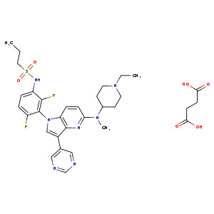 | SMILES | OC(=O)CCC(O)=O.CCCS(=O)(=O)Nc1ccc(F)c(-n2cc(c3c2ccc(n3)N(C)C4CCN(CC)CC4)-c5cncnc5)c1F |