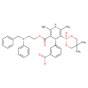 | 异名/同义词 | (R)-(-)-EFONIDIPINE 3-PYRIDINECARBOXYLIC ACID, 5-(5,5-DIMETHYL-1,3,2-DIOXAPHOSPHORINAN-2-YL)-1,4-DIHYDRO-2,6-DIMETHYL-4-(3-NITROPHENYL)-, 2-(PHENYL(PHENYLMETHYL)AMINO)ETHYL ESTER, P-OXIDE, (R)- 3-PYRIDINECARBOXYLIC ACID, 5-(5,5-DIMETHYL-2-OXIDO-1,3,2-DIOXAPHOSPHORINAN-2-YL)-1,4-DIHYDRO-2,6-DIMETHYL-4-(3-NITROPHENYL)-, 2-(PHENYL(PHENYLMETHYL)AMINO)ETHYL ESTER, (4R)- EFONIDIPINE (R)-FORM [MI] EFONIDIPINE, (-)- EFONIDIPINE, (R)-